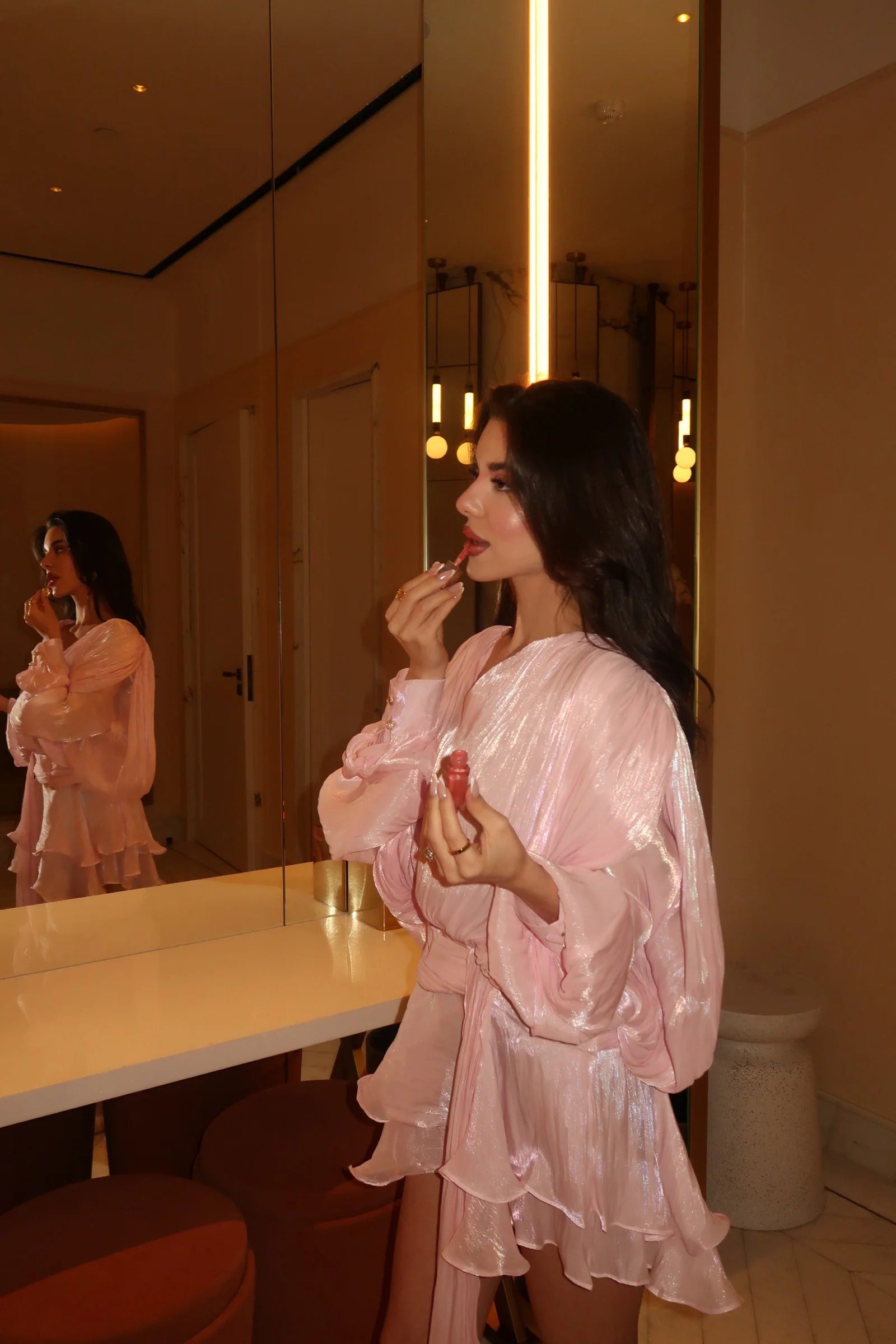 A refined piece that captures both sophistication and allure. Designed in a soft blush hue, this lightweight, fluid mini dress flatters the figure with its gently gathered waist, graceful draping, and a silhouette that feels as sensual as it does effortless.